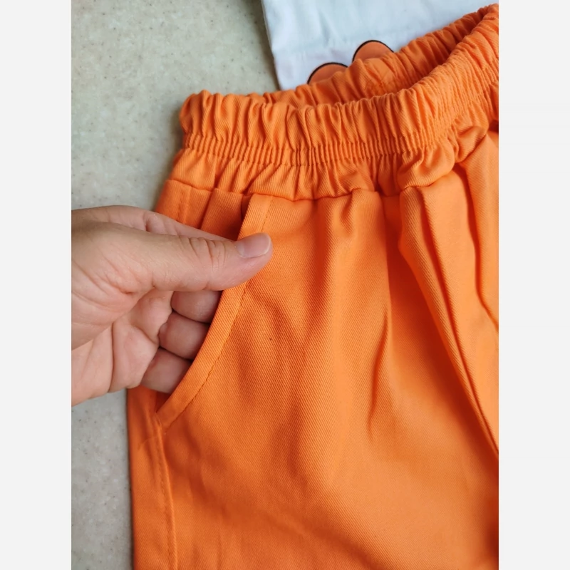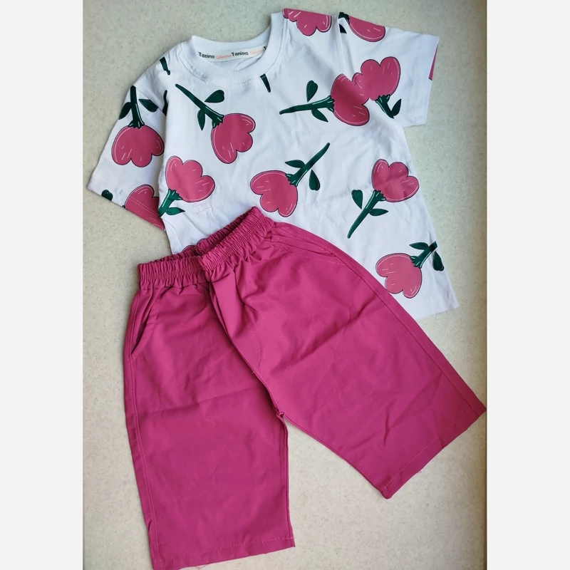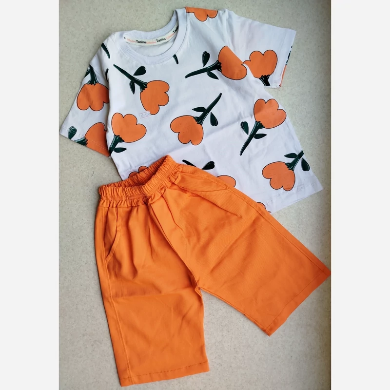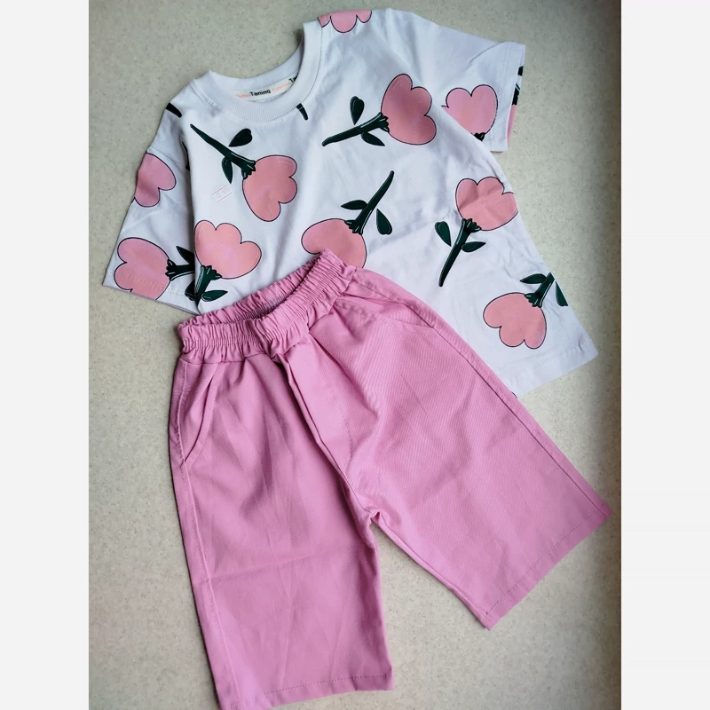 ست دخترانه تیشرت پنبه خالص یکرو و شلوارک کتان جیب دار گرم بالا و اعلا